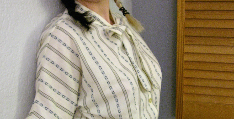 I measured out this really great fabric and was pleased to have a 1 1/2 yards of 60" width fabric to work with. The only label on this one said "washed" so I know the fabric was pre-shrunk at least. I'm going to assume its cotton, after having sewn and pressed the fabric multiple times I'm confident it is either cotton or linen. I tried to lay it out multiple ways but but I could only fit one blouse on this fabric which wasn't the worst thing ever. I stitched the thing up, had some trouble with the bow, and succeeded in the end! So soon as I was done I was so excited I called my sister to show her the shirt and she loved it! My sister and I both love westerns, and when she was little she always dressed up like a cowgirl which was why I thought of her in the first place. Even though in real life she's a librarian, I know in her heart she's a cowgirl.